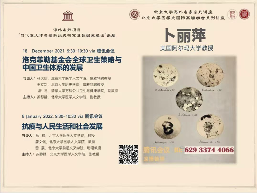 With the support of Peking University Distinguished Lectureship (北京大学海外名家讲学计划) and Chinese National Social Science Foundation Major Project of the “Contemporary Historiography and Database Construction of Epidemics” (0&ZD224), Professor Bu Liping, chair in the history department at Alma College in the United States, was invited to give two online lectures on the hot spots of global health history. The series of lectures were chaired by Associate Professor Su Jingjing (苏静静), from the School of Medical Humanities of Peking University, and organized under the titles of “Rockefeller Foundation’s Global Health Strategy and the Development of China’s Health System” (December 18, 2021), “Fighting against Epidemics, People’s Life and Social Development” (January 8, 2022).