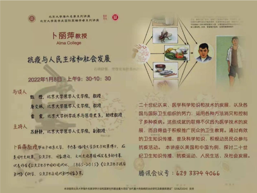 On January 8, 2022, Professor Bu Liping delivered the second online lecture “Fighting against Epidemics, People’s Life and Social Development”. The lecture took the United States and China as examples and discussed the propagation of hygienic knowledge, the movement of fighting against epidemics, people’s life and social development in the 20thcentury. The lecture was chaired by Su Jingjing (苏静静), associate professor from Peking University School of Medical Humanities. Three experts in this field were invited for the dialogue session, who are Prof. Zhen Cheng (甄橙), from School of Medical Humanities, Peking University; Prof. Tang Wenpei (唐文佩), Professor from School of Medical Humanities, Peking University; John N. Alekna (雷震), assistant professor from Peking University Department of History of Science, Technology and Medicine.