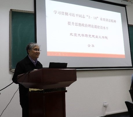 仝华教授,1999-2009年曾任北京大学马克思主义学院副院长,主管思想政治理论课的教学工作,为北京大学马克思主义学院博士生导师,兼任北京大学中国特色社会主义理论体系研究中心研究员,现任教育部“中国近现代史纲要”课教学指导委员会委员、中央马克思主义理论研究和建设工程《中国近现代史纲要》教材编写组主要成员。仝华教授以“学习贯彻习近平同志‘3·18’重要讲话精神,提升思想政治理论课建设水平”为题,向在座的教师和研究生们介绍了学校思想政治理论课教师座谈会的概况,传达了习近平总书记在座谈会上的重要讲话。在接近两个小时的宣讲会上,仝华教授为大家宣讲了习近平总书记在座谈会的重要讲话,同时也介绍了习近平总书记对思政理论课教师提出的希望。根据仝华教授的宣讲,大家对习总书记讲话中的以下内容产生深刻认识,即加强党对思想政治理论课建设的领导;办好思想政治理论课意义重大;办好思想政治理论课关键在教师,关键在发挥教师的积极性、主动性、创造力;推动思想政治理论课改革创新,要不断增强思政课的思想性、理论性和亲和力、针对性。
