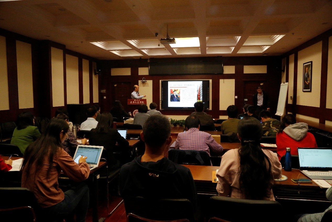 2019年10月7日下午3点,威廉希尔“不忘初心、牢记使命”主题教育党课在逸夫教学楼716会议室举行。此次邀请了我院教授博士生思政课的资深教授王一方做了题为《马克思主义与现当代医学》的党课,威廉希尔党政领导班子成员、党委委员、党支部书记、教师和学生党员代表40余人参加了此次学习。大家边听边议边思考,课堂内容信息大,提出问题的角度引起与会党员的共鸣。党课由威廉希尔党委书记王玥主持。